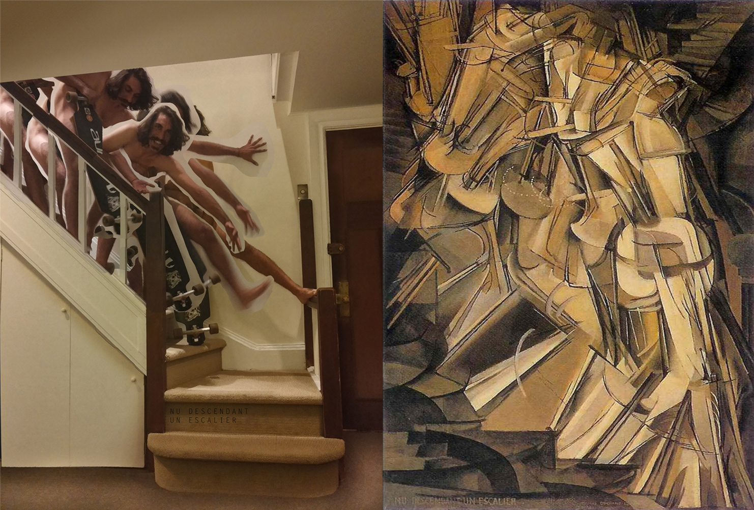A cocktail party in Manhattan revealed itself to be in the same building in which Duchamp painted his nude descending a staircase. An impromptu photoshoot ensued, resulting in this tribute to Nu Descendant Un Escalier.